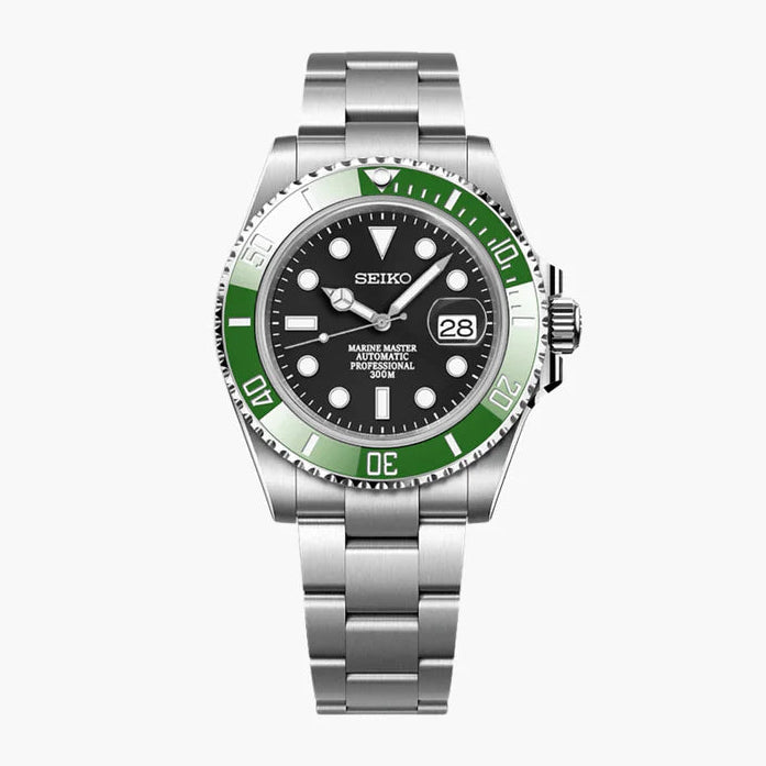 Inspired by the iconic Submariner design, the Seiko Mod Submariner features the renowned Seiko NH35 automatic movement. This 40 mm timepiece offers high-end quality and precision, blending excellence with accessibility in a sleek, modern watch.