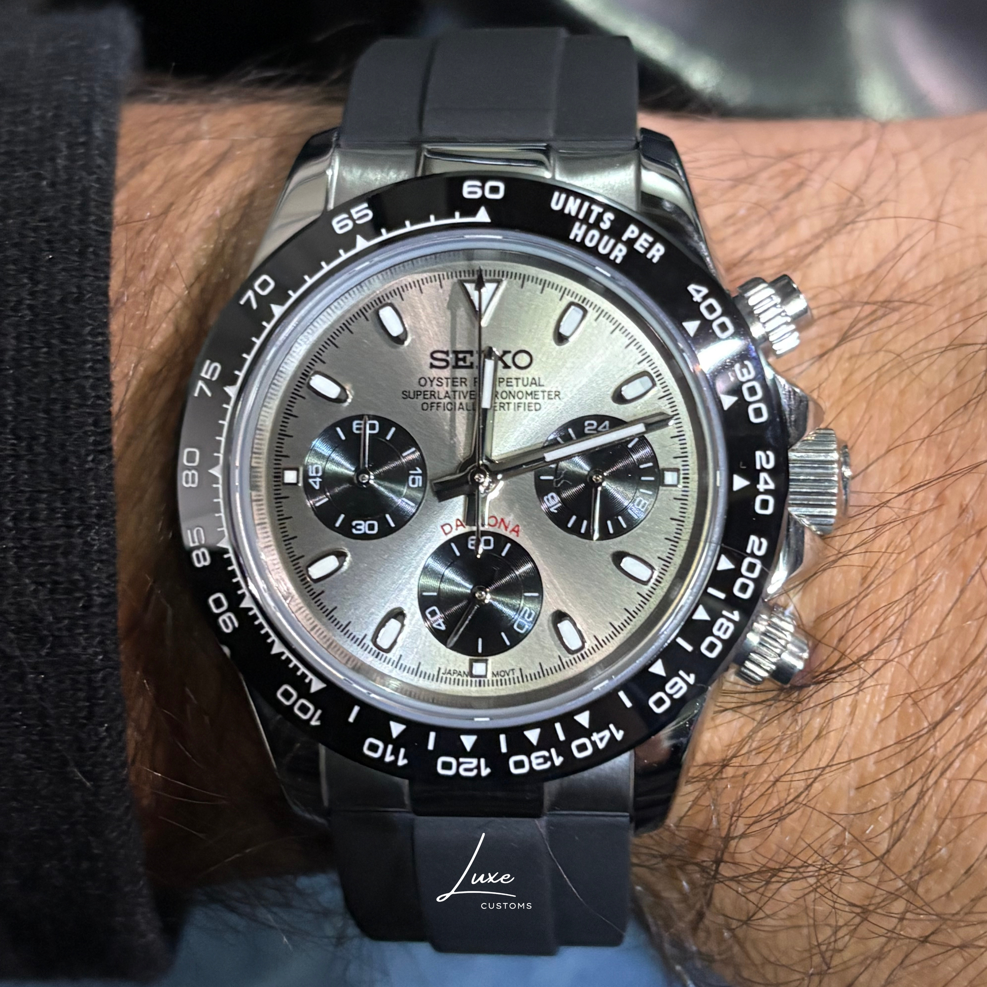 Inspired by the iconic Daytona and powered by the prestigious Seiko VK63 hybrid movement, the Seiko Mod Daytona is a 40 mm high-end watch merging excellence and affordability.